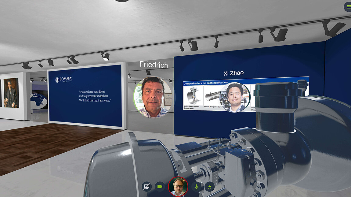 Der virtuelle BOMAFA Showroom liegt mitten in der Produktionshalle und zeigt das gesamte Armaturen-Portfolio in 3D. Was bisher nicht ohne weiteres möglich war, kann nun realisiert werden. Gäste des Unternehmens melden sich via Browser an und aktivieren ihr Kamerabild und den Ton. Dann beginnt das Gespräch in der BOMAFA Produktionsumgebung.
