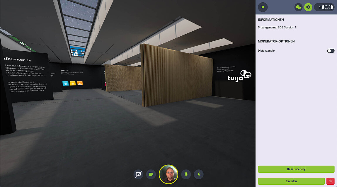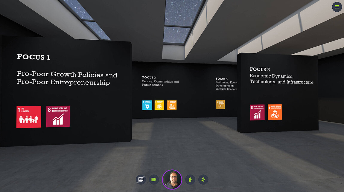 Die abschließende Alumni-Konferenz zielte darauf ab, durch Fallstudien und Workshops kreative Lösungen im Rahmen von Know-how-Transfer und politischem Lernen zu erarbeiten. Der Fokus der Konferenz lag auf vier SDG-bezogenen Themenclustern wie z.B. Pro-Poor Growth Policies und Pro-Poor Entrepreneurship (SDGs 1 & 8) oder Wirtschaftsdynamik, Technologie und Infrastruktur (SDGs 8 und 9). Besonders wichtig außerdem: Wirtschaftliche Entwicklung neu denken: Kreislaufwirtschaft (SDG 12). Zu allen Themen hatten die Student:innen Poster erarbeitet, die sie im virtuellen Raum präsentierten. Durch den Distanzsound konnten zeitgleich die etwa 150 Kongressbesucher:innen in den direkten Austausch mit den Alumni treten und sie in ihren jeweiligen SDG-Pavillions besuchen. Die einen empfingen mit ihrem eigenen Ambient-Sound, die anderen akquirierten auf der virtuellen Campusfläche vor den Pavillons. Networking at its best.